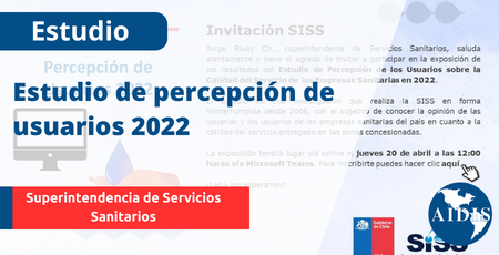 La Superintendencia de Servicios Sanitarios, saluda atentamente y tiene el agrado de invitar a participar en la exposición de los resultados del Estudio de Percepción de los Usuarios sobre la Calidad del Servicio de las Empresas Sanitarias en 2022.